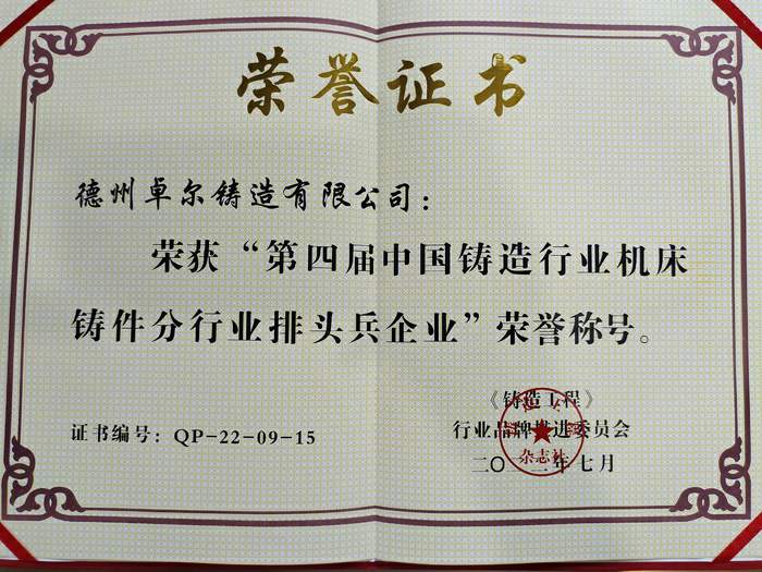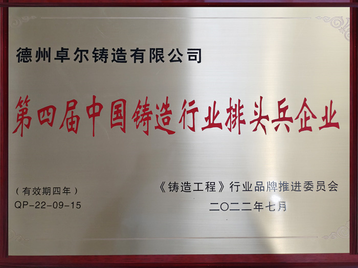 2022年7月25日,第九屆全國鑄造行業(yè)發(fā)展論壇暨中國鑄造協(xié)會(huì)第九界會(huì)議代表大會(huì)在天津勝利召開,德州卓爾科技有限公司榮獲“第四屆中國鑄造行業(yè)排頭兵企業(yè)”及“第四屆鑄造行業(yè)機(jī)床鑄件分行業(yè)排頭兵企業(yè)”榮譽(yù)稱號